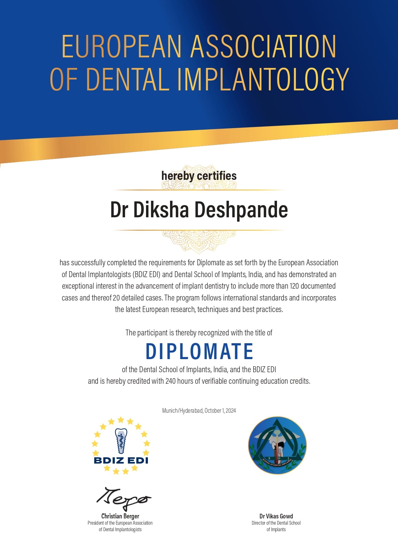 (International Congress of Oral Implantology) credentials.